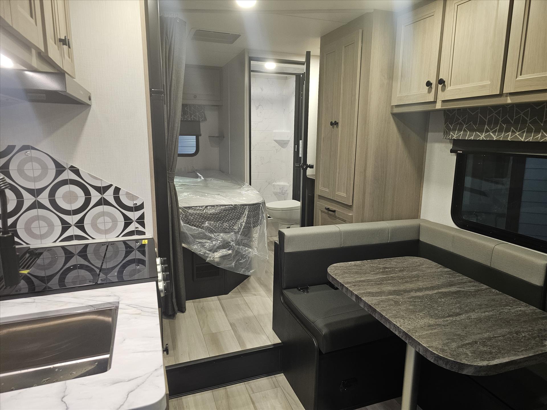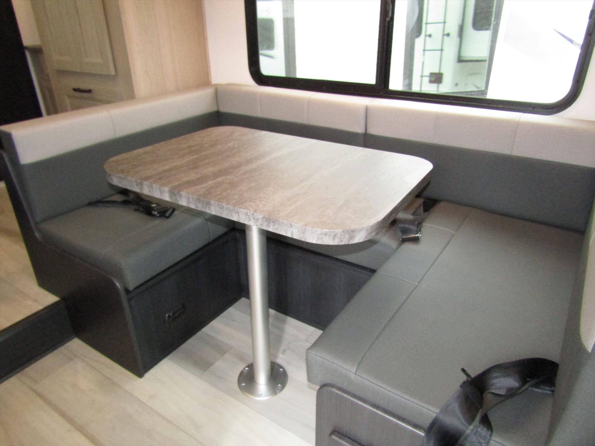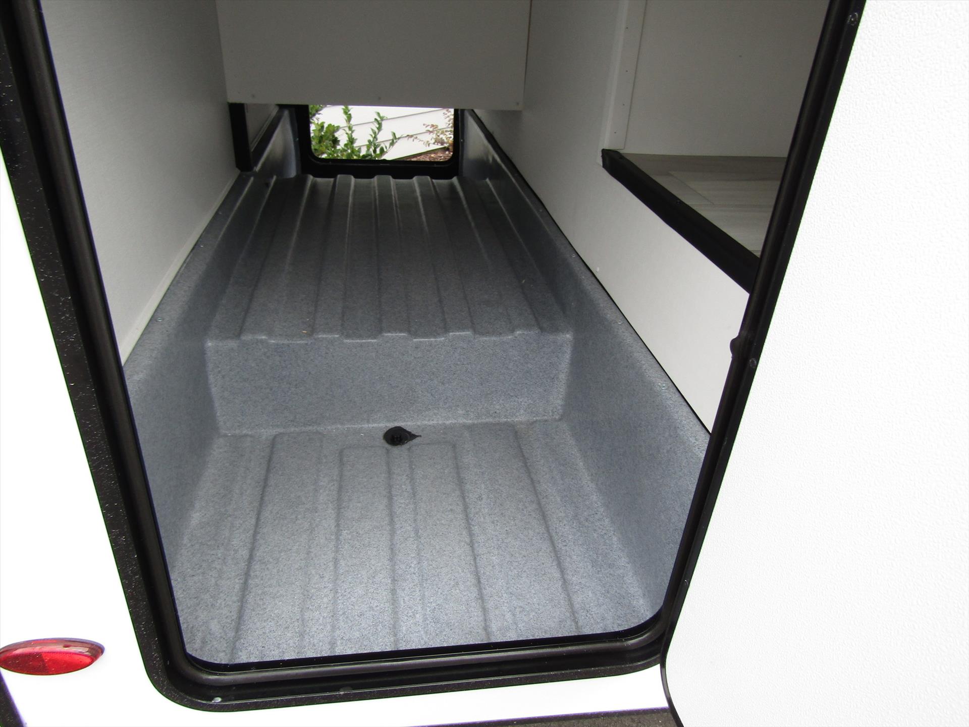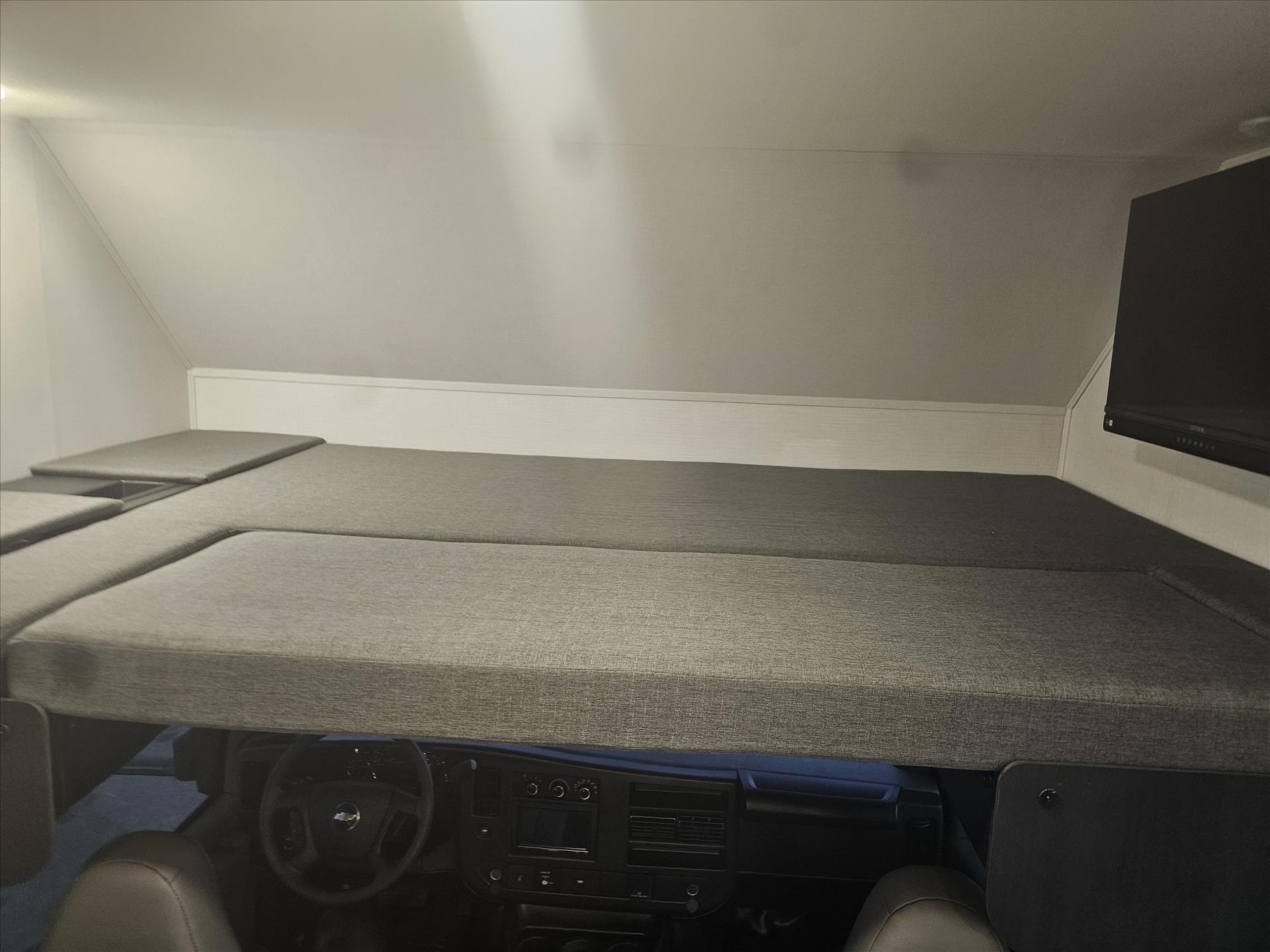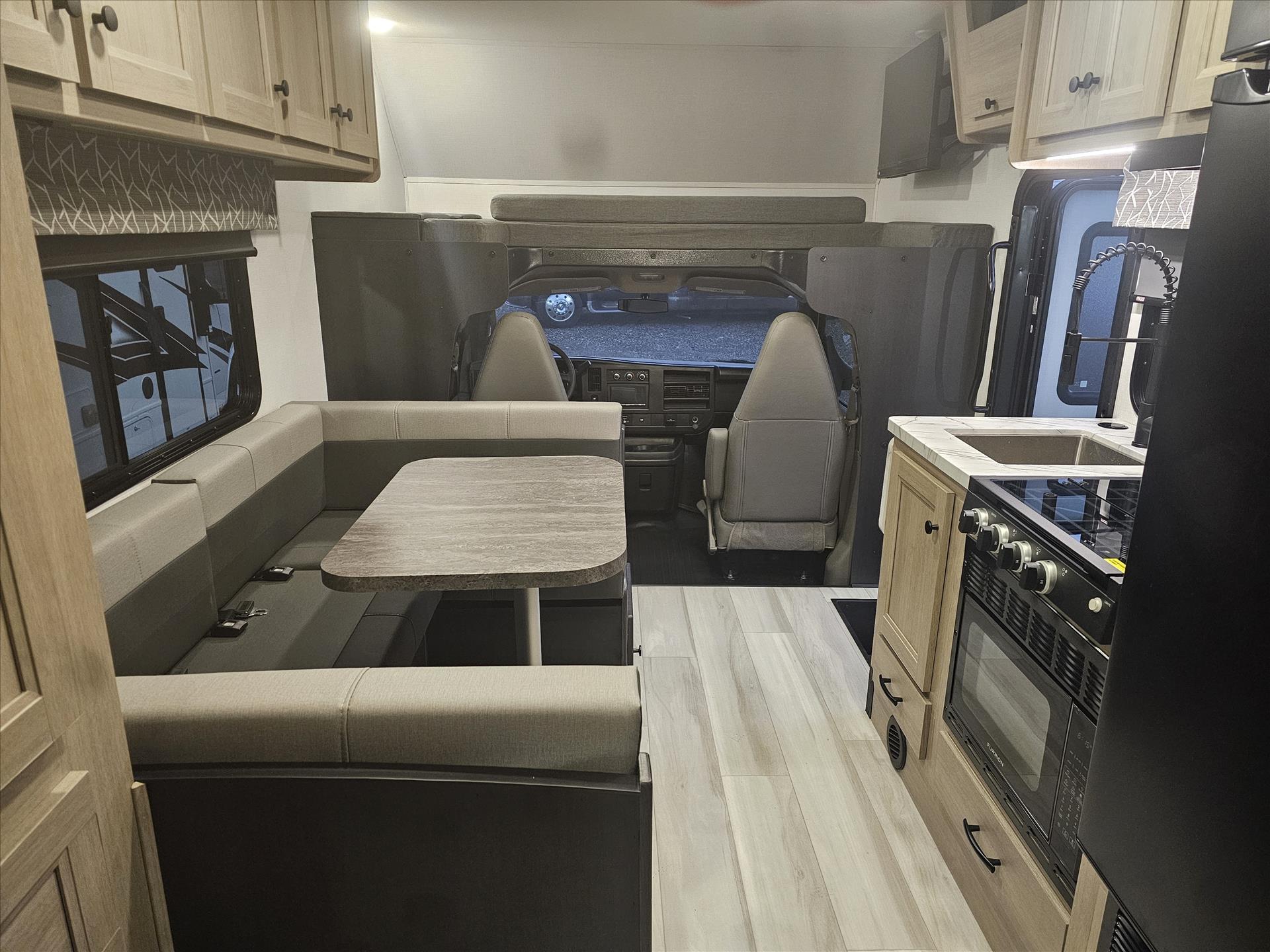 The 2350LE is 25' total length built on a Chevy 3500 chassis that holds 57 gal. The rear of the unit contains the bedroom and bath, with a 60" x 80" queen bed and a 24" x 32" shower with molded surround. Skylights add to the natural light and allow for fresh air as well. The large U-shaped dinette is perfect for meals or family game night, while also providing a second sleeping surface. The kitchen features a 12V refrigerator, booth dinette, cooktop, convection microwave, and sink with a flip-up counter extension.