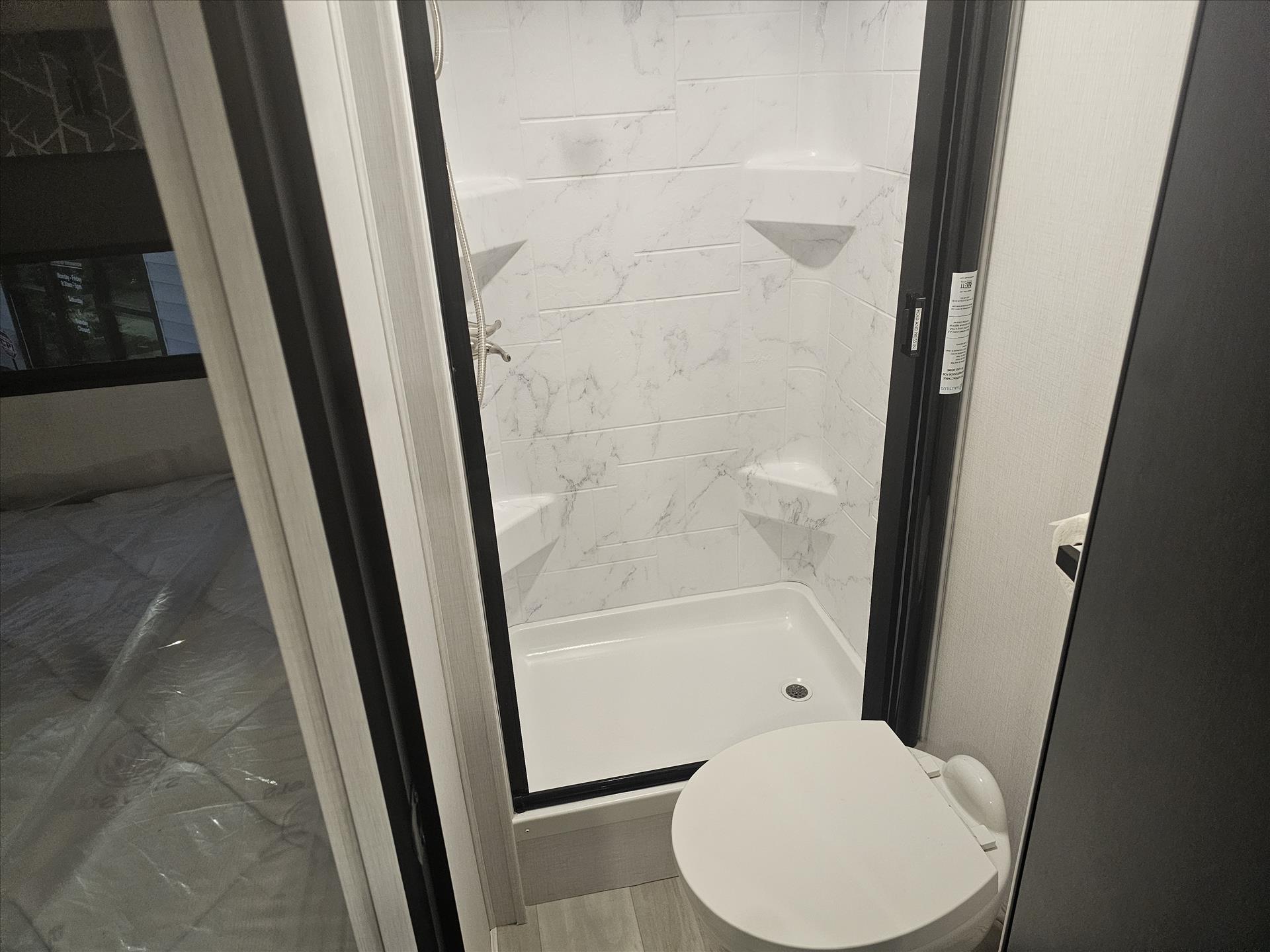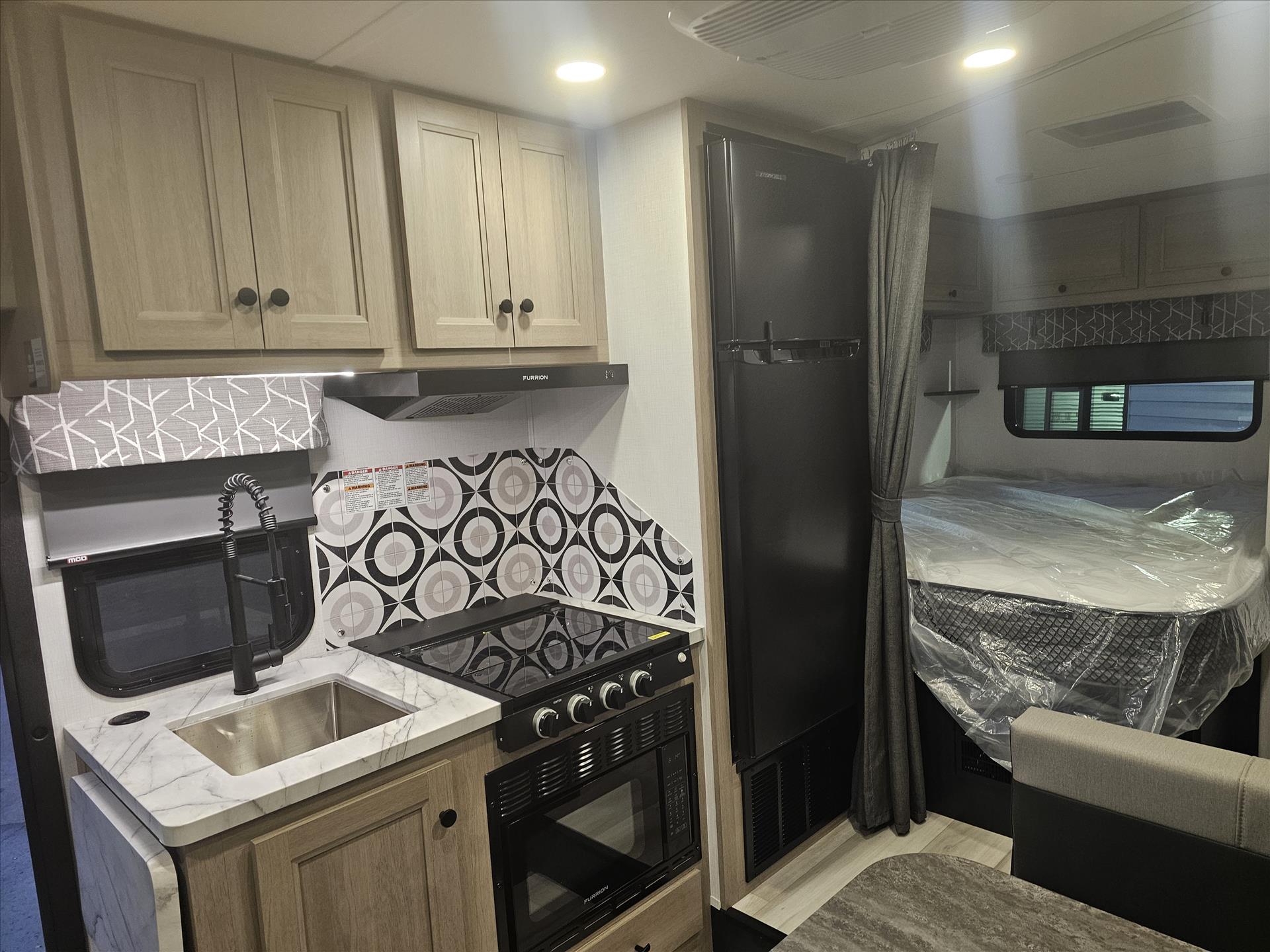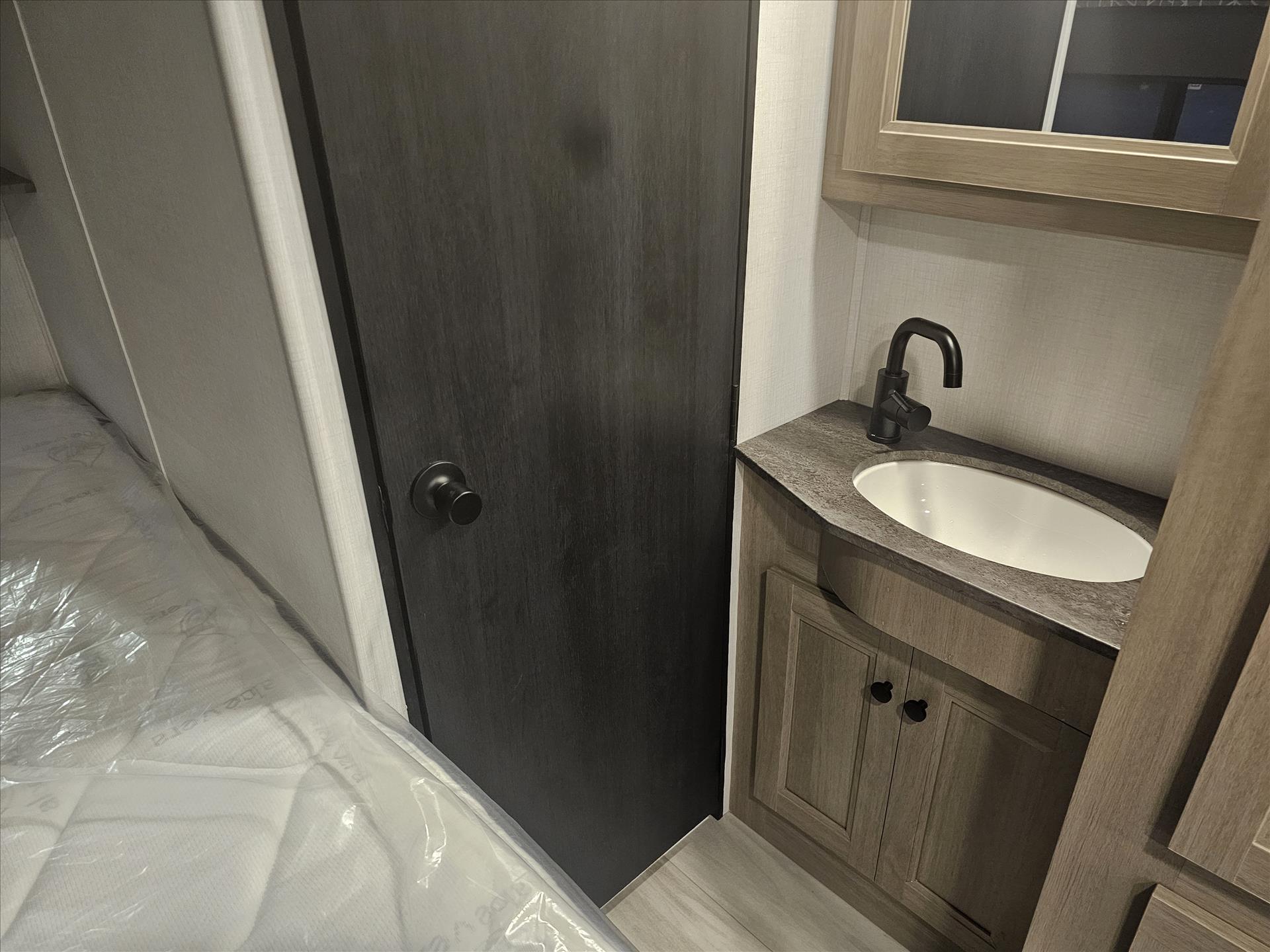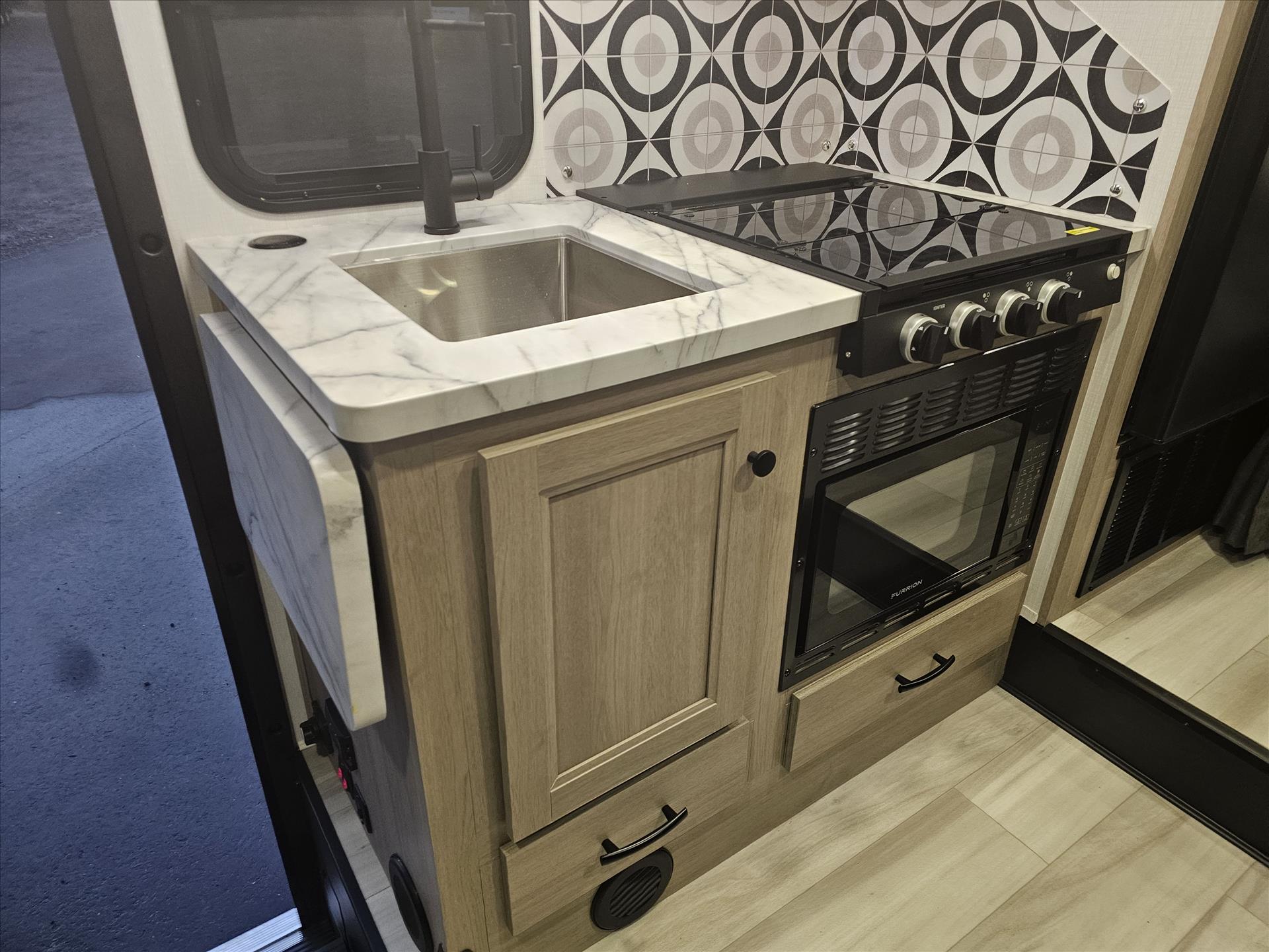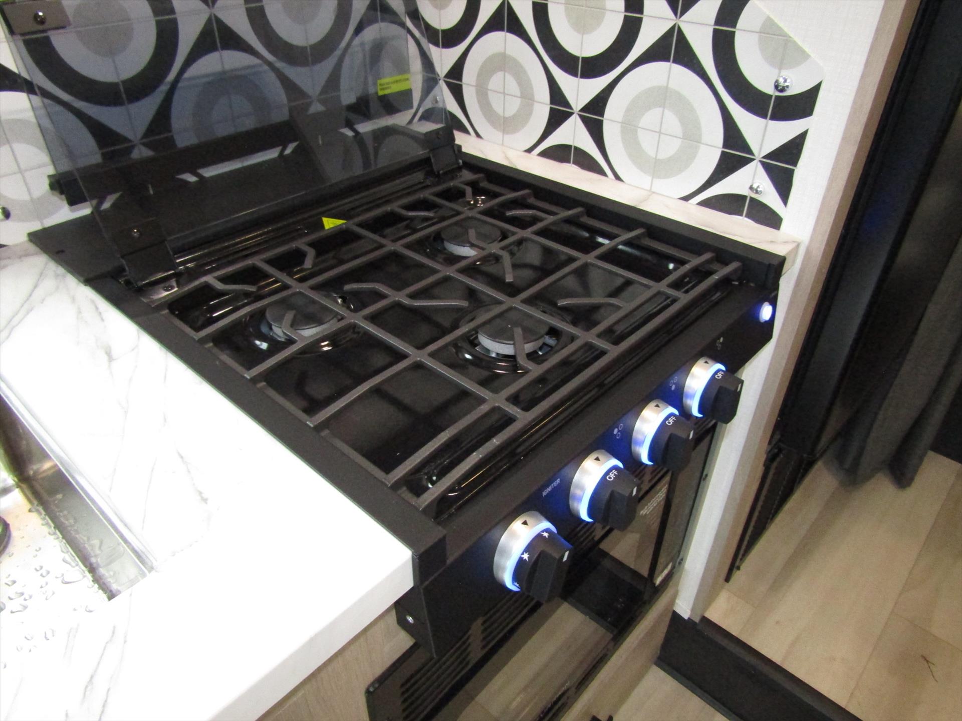 The 2350LE is 25' total length built on a Chevy 3500 chassis that holds 57 gal. The rear of the unit contains the bedroom and bath, with a 60" x 80" queen bed and a 24" x 32" shower with molded surround. Skylights add to the natural light and allow for fresh air as well. The large U-shaped dinette is perfect for meals or family game night, while also providing a second sleeping surface. The kitchen features a 12V refrigerator, booth dinette, cooktop, convection microwave, and sink with a flip-up counter extension.
