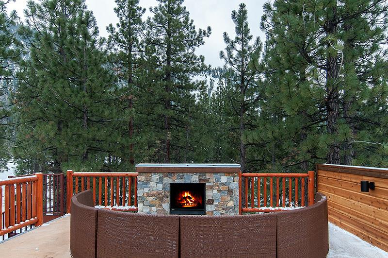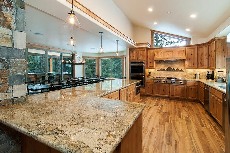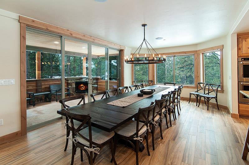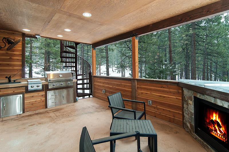 Main living room has huge vaulted ceilings with forest and Heavenly Slope views. Sectional sofa in front of oversized rock wall fireplace, large TV set above Fireplace. Huge dining table from Restoration Hardware with comfortable chairs. Bar stools surround large kitchen island with all top of the line appliances, granite, alder cabinetry. This main living room connects to a covered outdoor area with dining table, bar stools, Fireplace. This outdoor deck has an additional staircase that takes you to a huge outdoor rooftop deck with modern wicker outdoor furniture, dining table, all set in front of a fireplace. 360 degree views, half of the view looks at the lake and the other half looks directly at the face of the slopes its so close you can see the Gondolas going up the mountain.