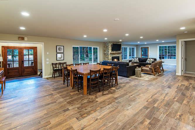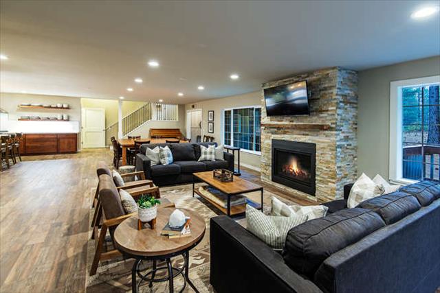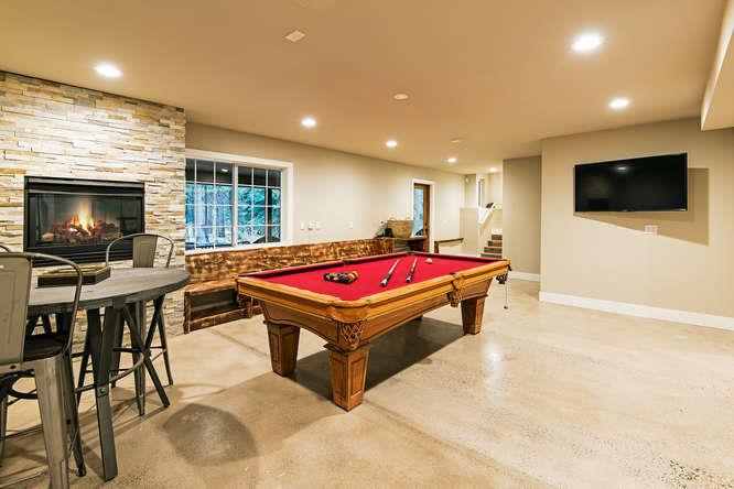 Downstairs is centered around a game room with pool table, bar pub table top, fireplace, flat screen TV...