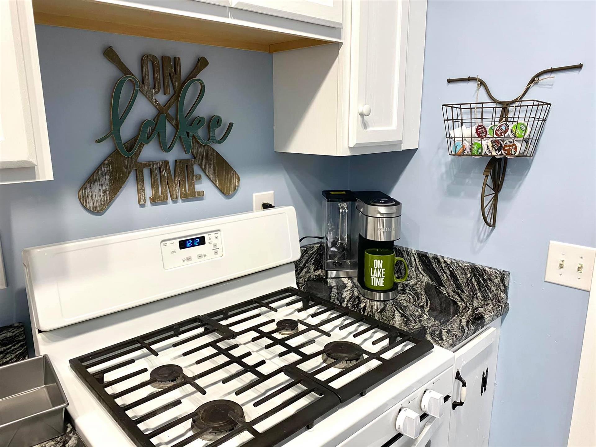 Kitchen - Refrigerator, dishwasher, gas stove, disposal, microwave, coffee pot, dishes, glasses, wine glasses, flatware.