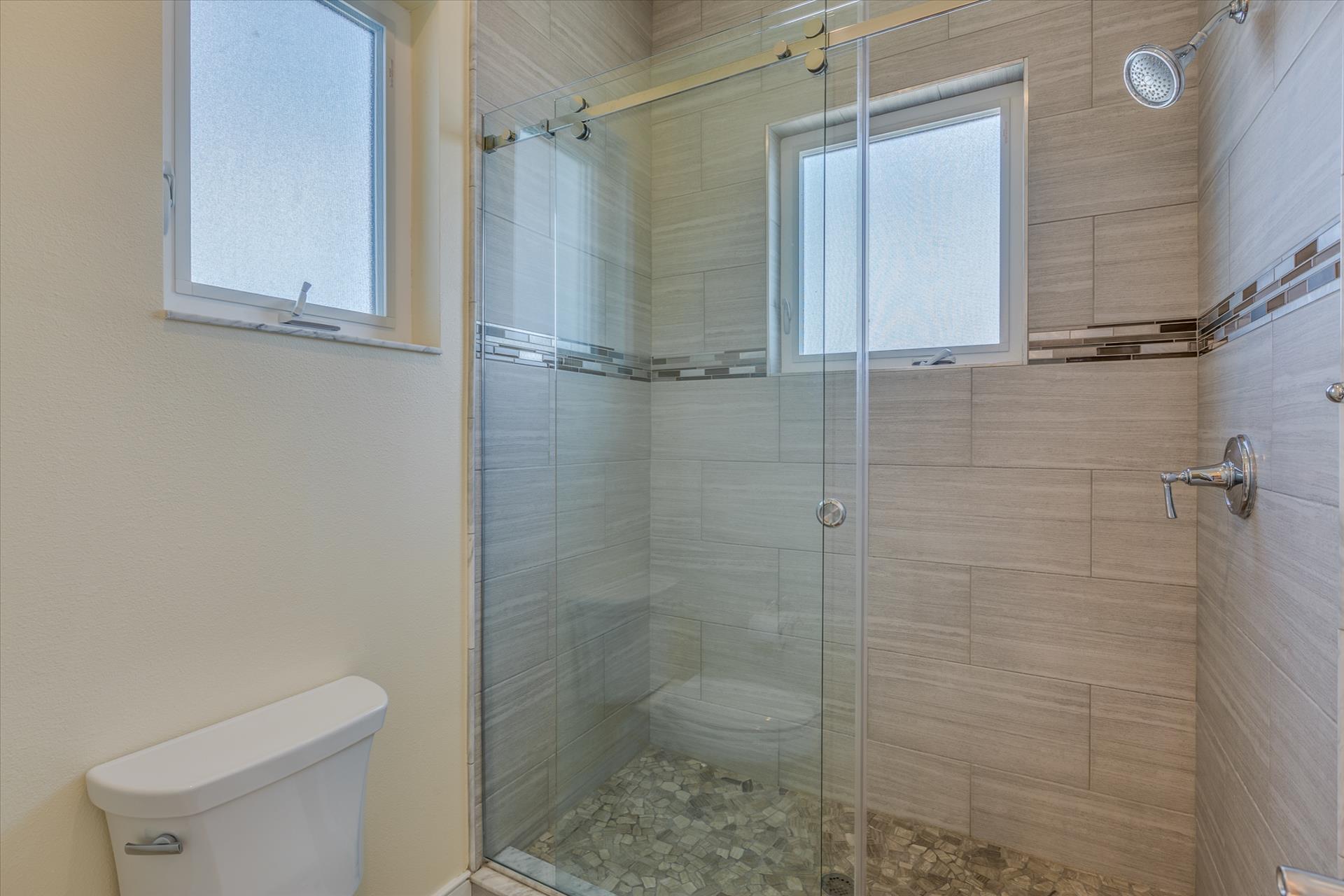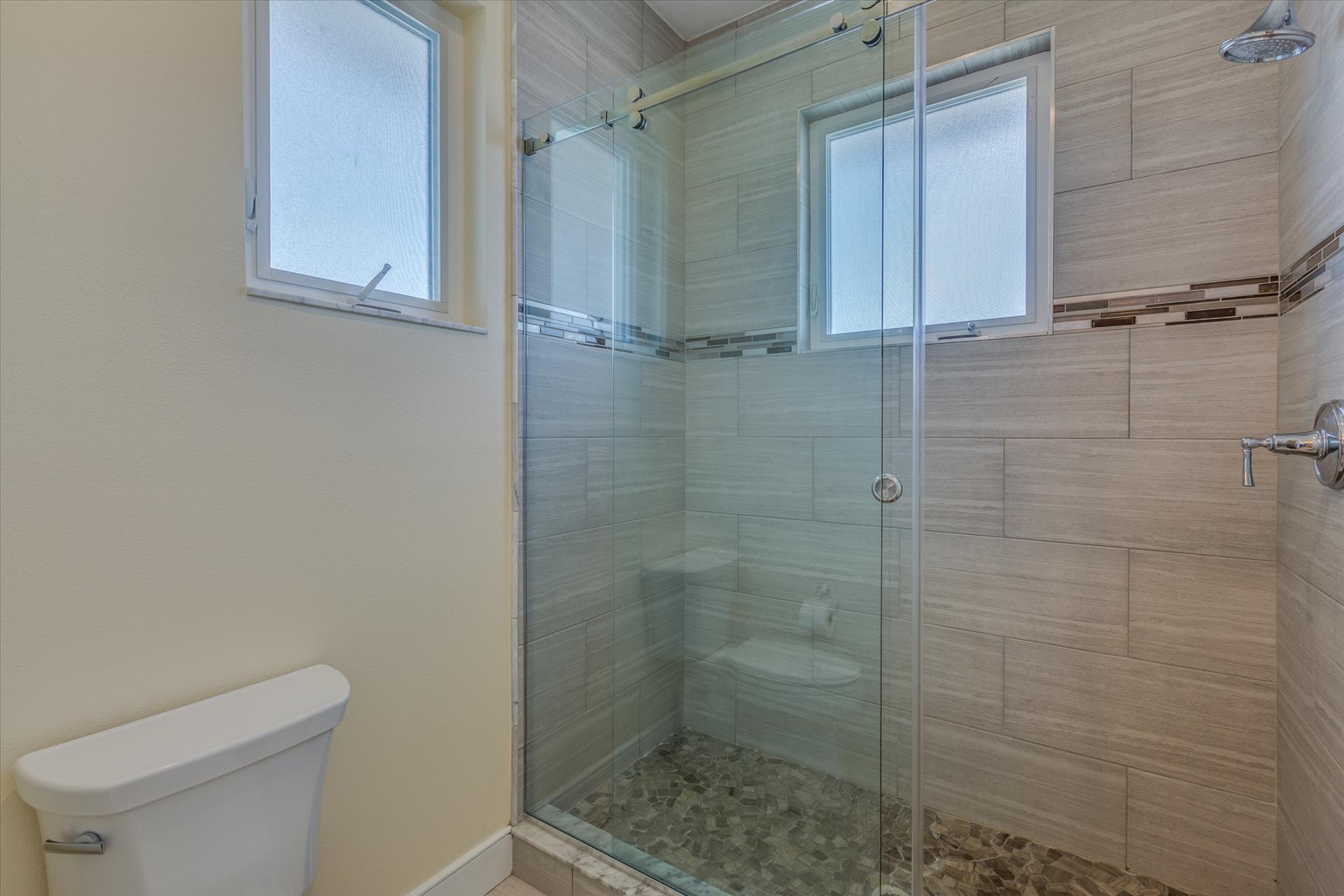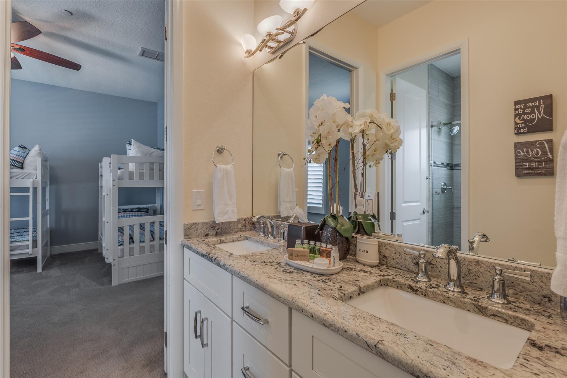 On this level are two bedrooms, one with a king bed, the other with two sets of bunk beds which will only accommodate children, these share a Jack'n'Jill bathroom. There is also a half bathroom for guests to use off of the living area.