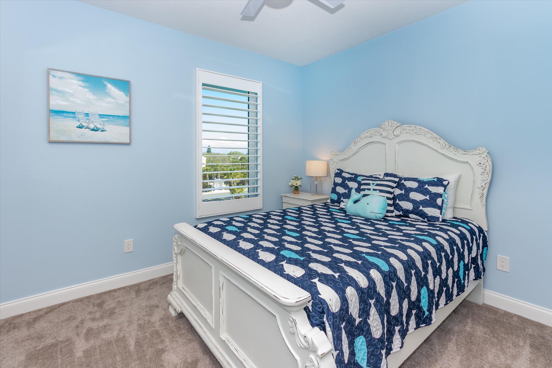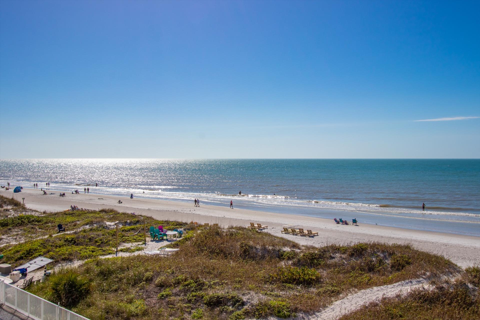 On the second floor you will walk into a large open living area with huge windows overlooking the beach. The living area also has a large sofa with flat screen TV. There is a fantastic kitchen featuring a gas hob and stove, electric combo oven/microwave, refrigerator and dishwasher with seating for 6 at the island. There is also a wet bar and breakfast nook together with a formal dining area. You can step out onto the balcony to BBQ or sit out and enjoy the breathtaking views. On this level there are two bedrooms, one with a king bed, the other with two sets of bunk beds, which will only accommodate children. These bedrooms share a Jack'n'Jill bathroom with shower. There is also a half bathroom for guests to use off of the living area.