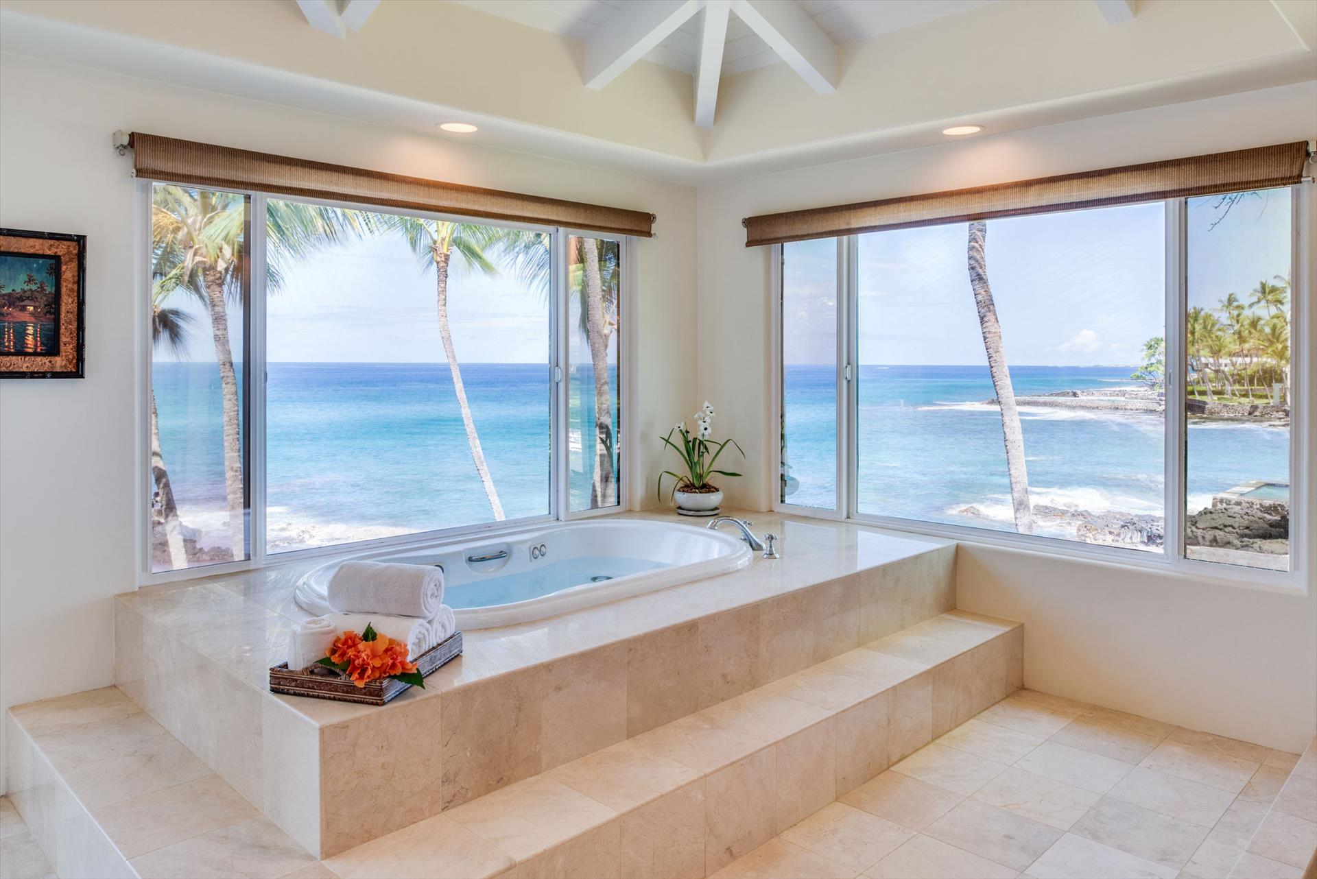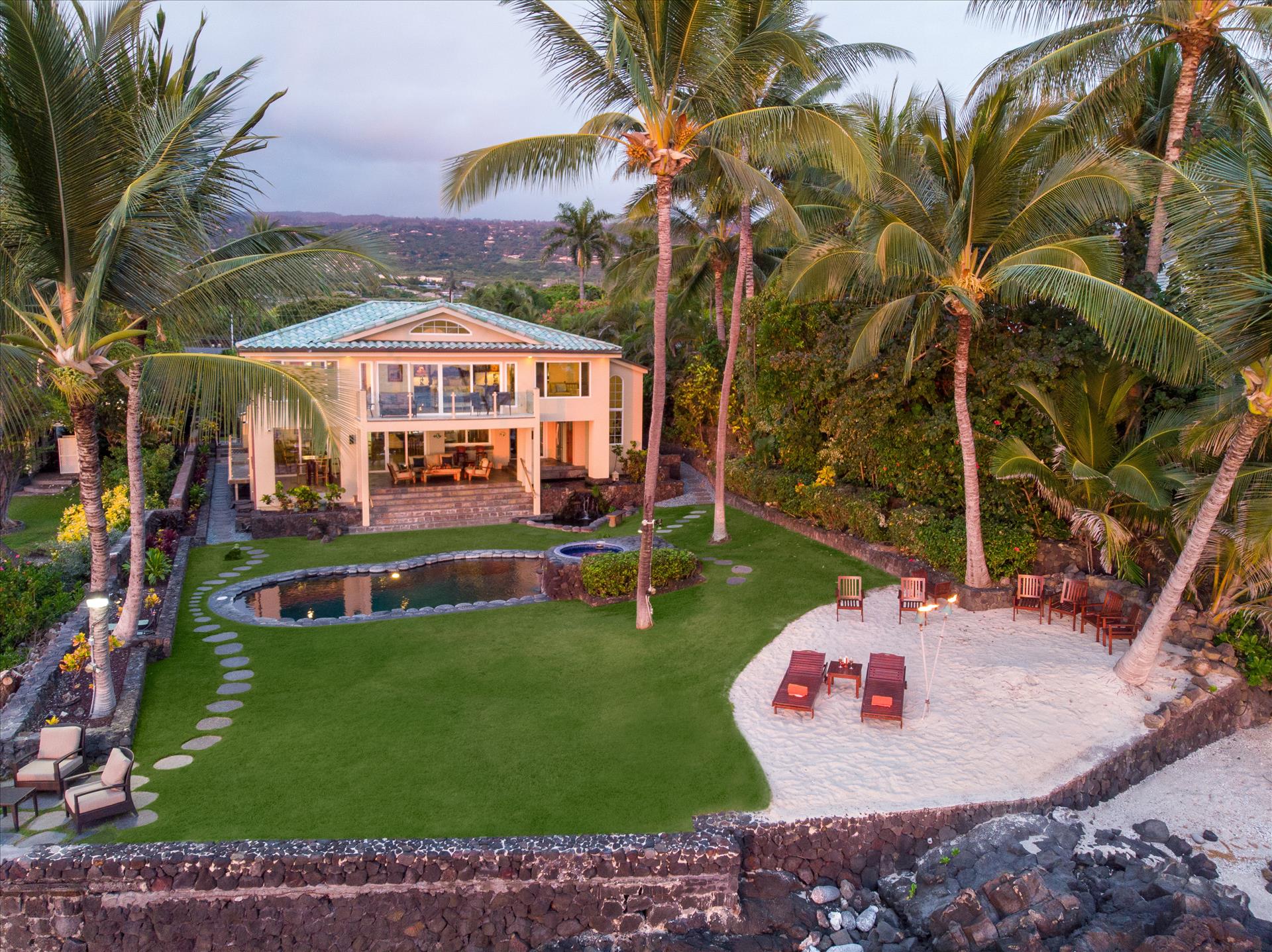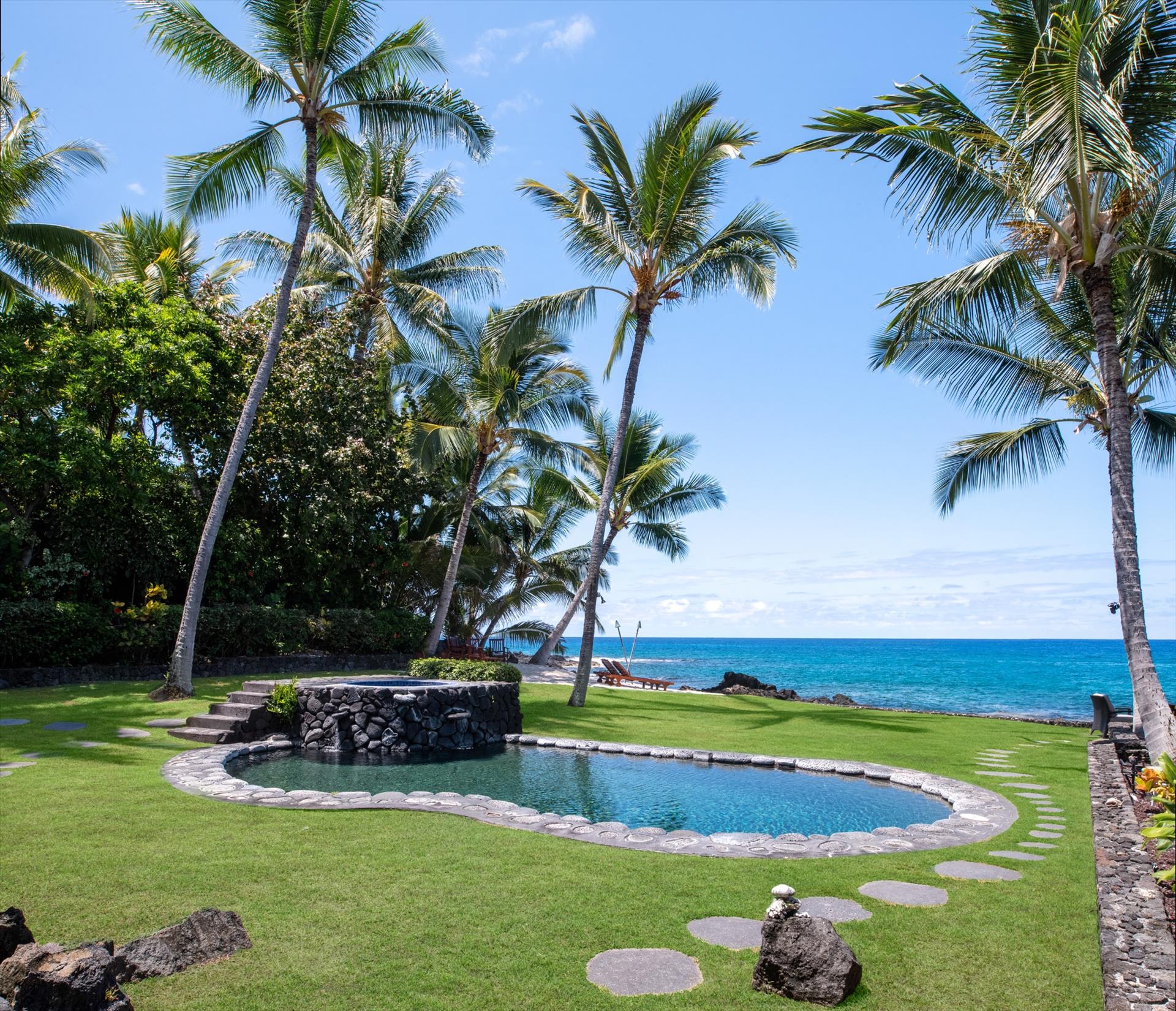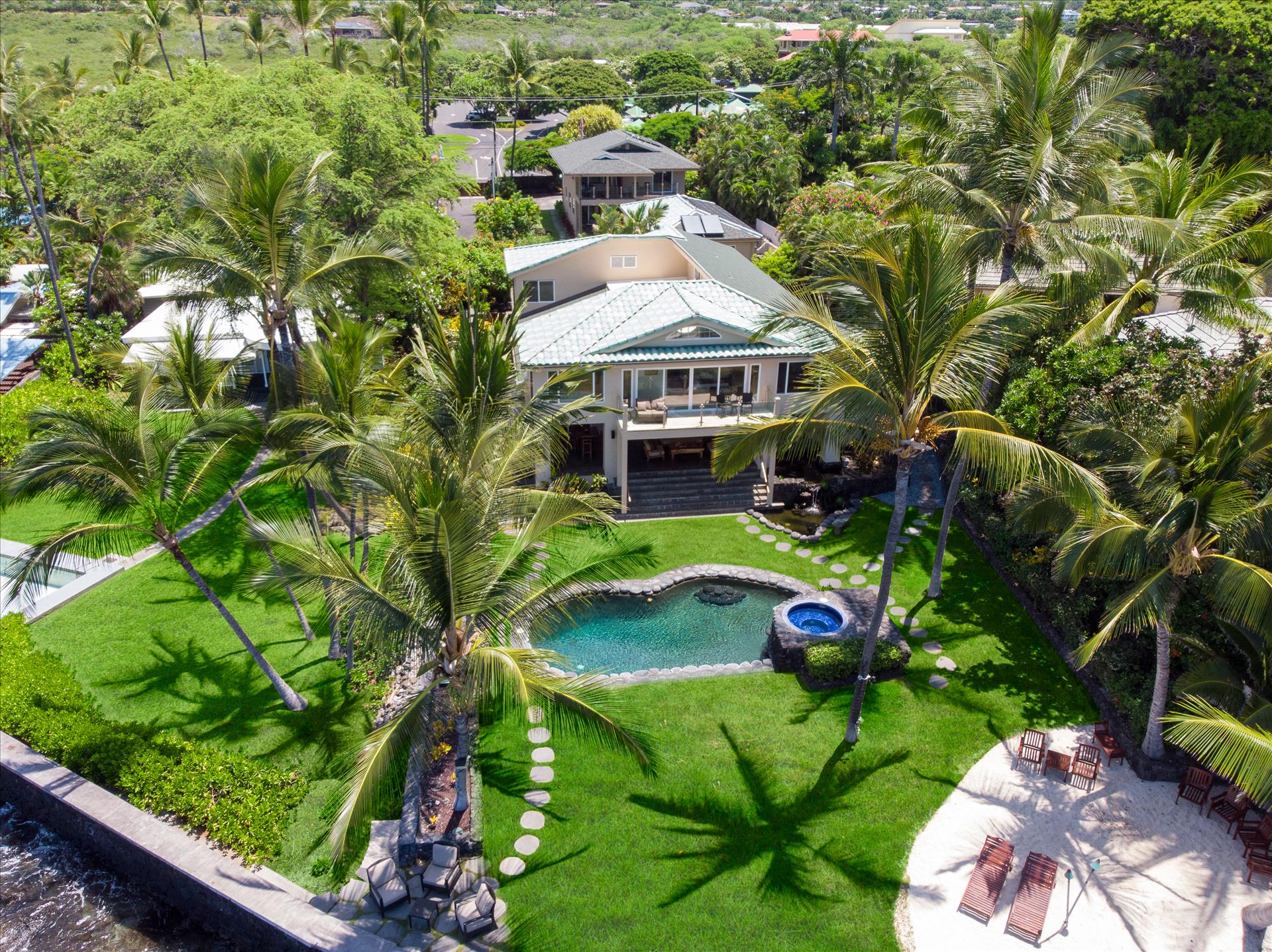 Oceanfront Makai Estate overlooks the refreshing freshwater pool and the rhythmic Pacific waves, the most breathtaking part of the Moana Makai Home may be the tranquil outdoor lanai. Spot the seasonal humpback whales while sipping your morning local Kona Coffee (arguably some of the best coffee on earth). Pods of local spinner dolphins swim by most days, making their daily commute. It truly becomes your own little piece of paradise-complete with a spectacular Hawaiian sunset to finish!