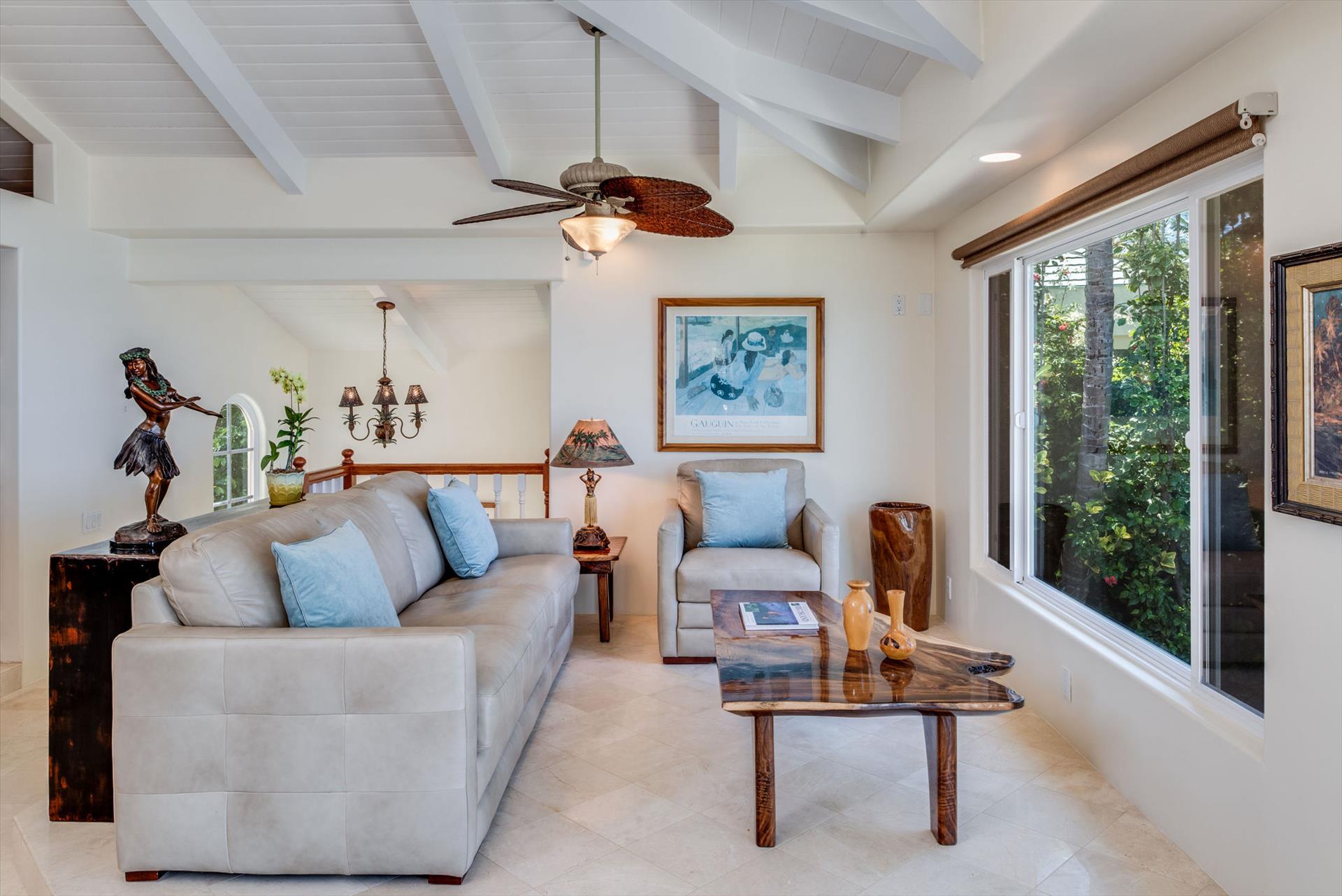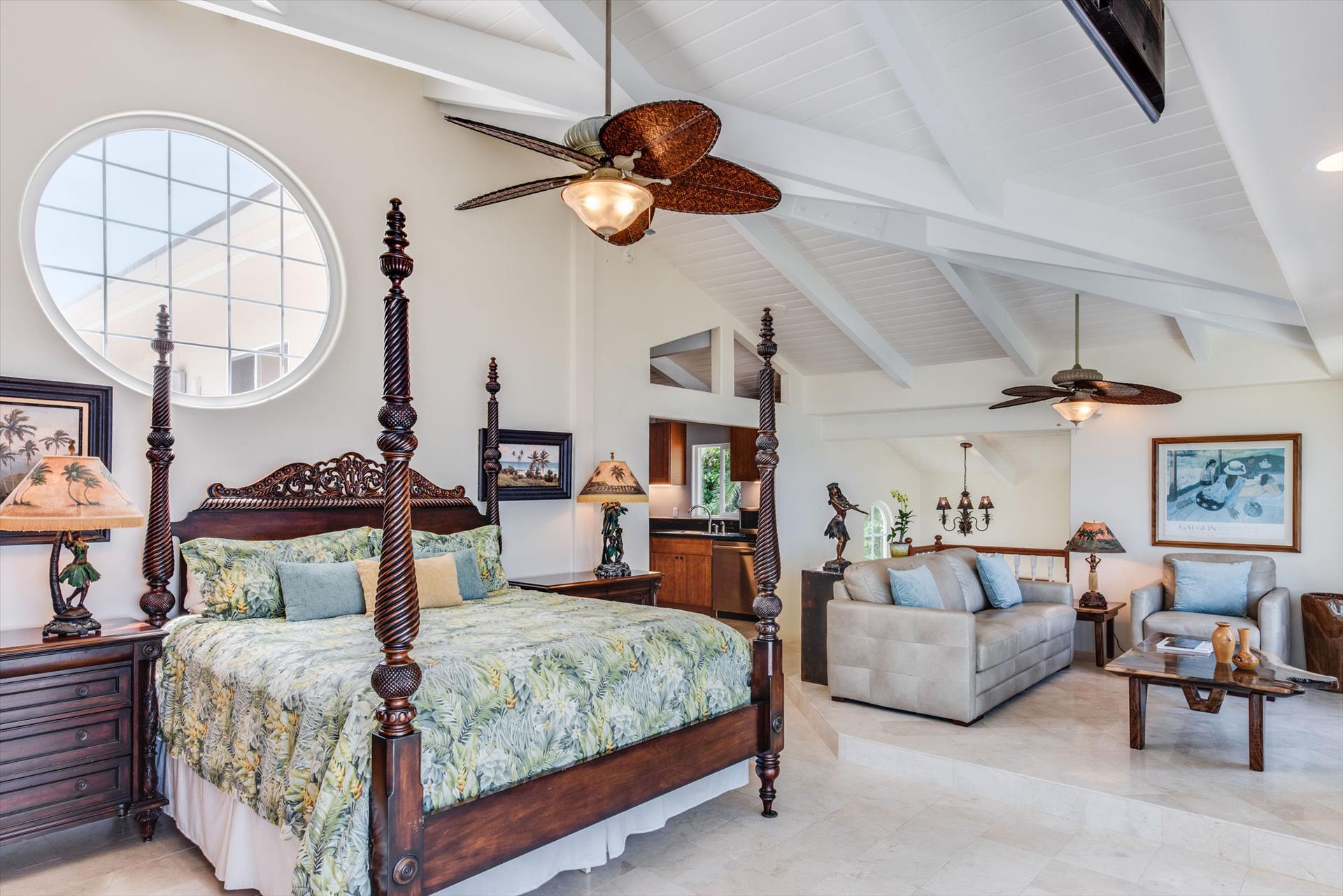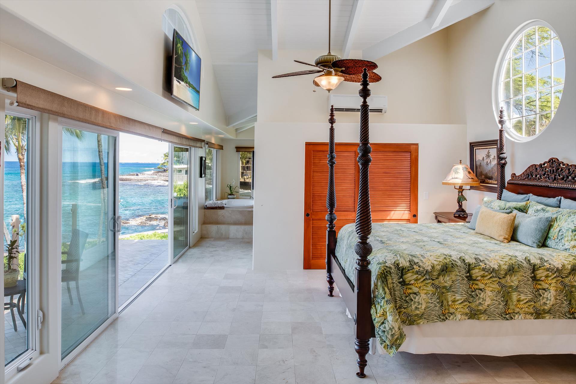 Oceanfront Makai Estate overlooks the refreshing freshwater pool and the rhythmic Pacific waves, the most breathtaking part of the Moana Makai Home may be the tranquil outdoor lanai. Spot the seasonal humpback whales while sipping your morning local Kona Coffee (arguably some of the best coffee on earth). Pods of local spinner dolphins swim by most days, making their daily commute. It truly becomes your own little piece of paradise-complete with a spectacular Hawaiian sunset to finish!