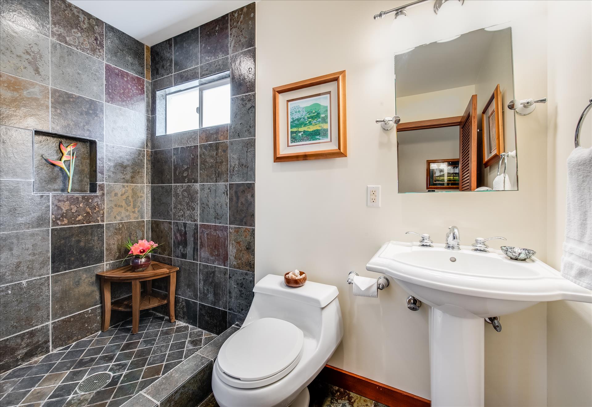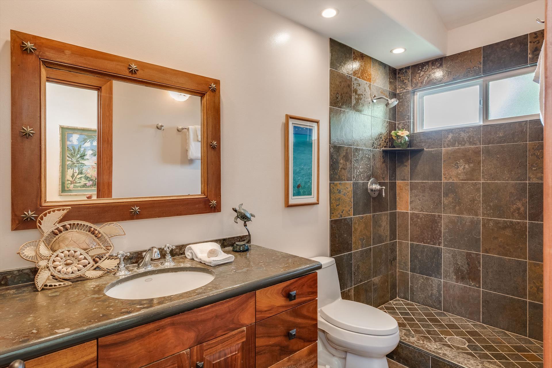 The main entrance to the Lucky Bennet designed home is composed of spectacular koi ponds. The bedrooms are furnished with Tommy Bahama Lexington furniture, two Kings, three Queens, and a room with two twin beds. Kitchen is composed of stainless-steel sub-zero refrigerator, Wolf oven, microwave, wine fridge, dishwasher and glass electric cooktop. Slate floors in all common areas and bedrooms. We have an amenity garage area with snorkeling gear, beach chairs, beach umbrellas, boogie boards, surf boards, and many beach coolers.