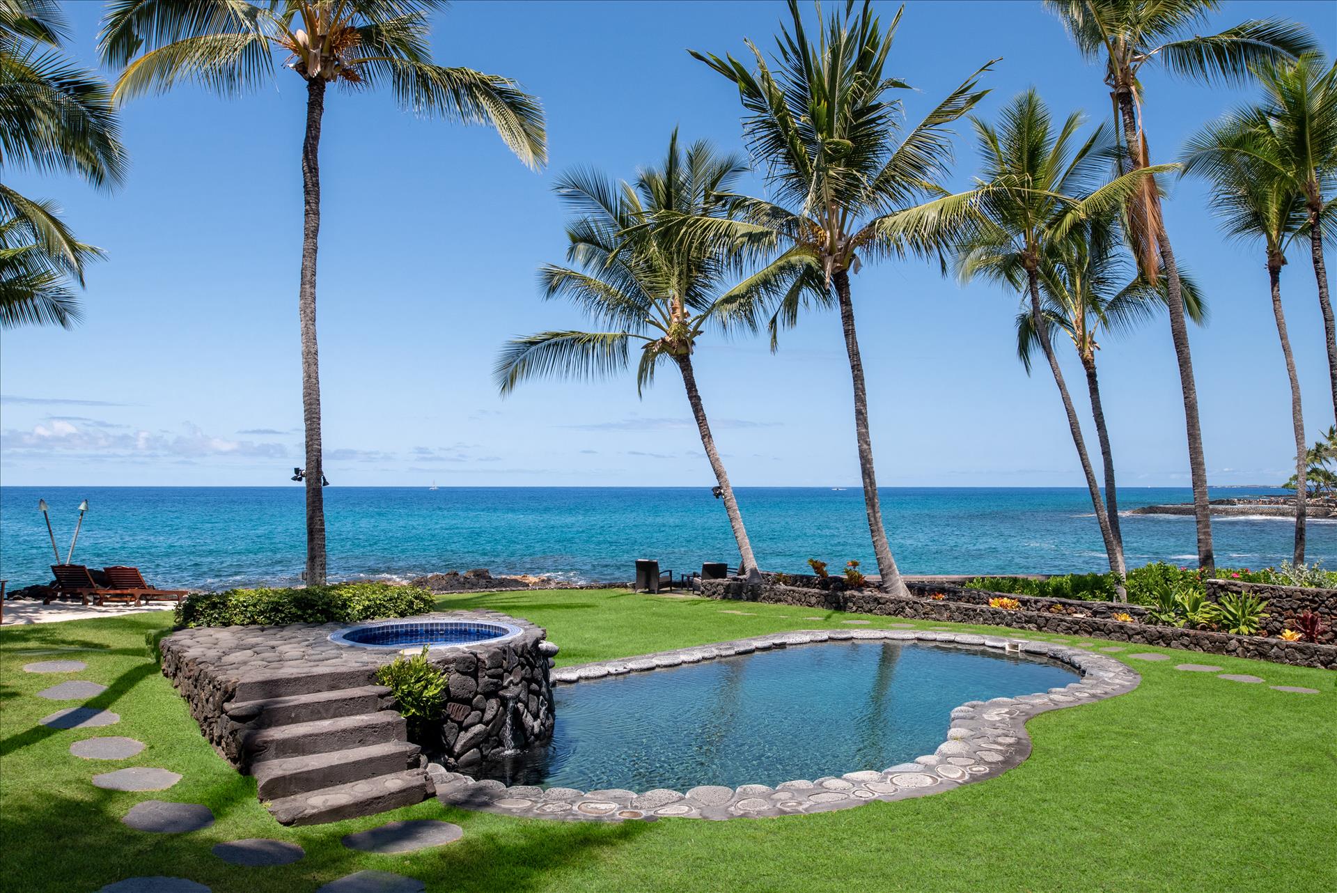 Our guests are invited to share the oceanfront pool and jacuzzi, as well as the two separate seating areas along the ocean wall.