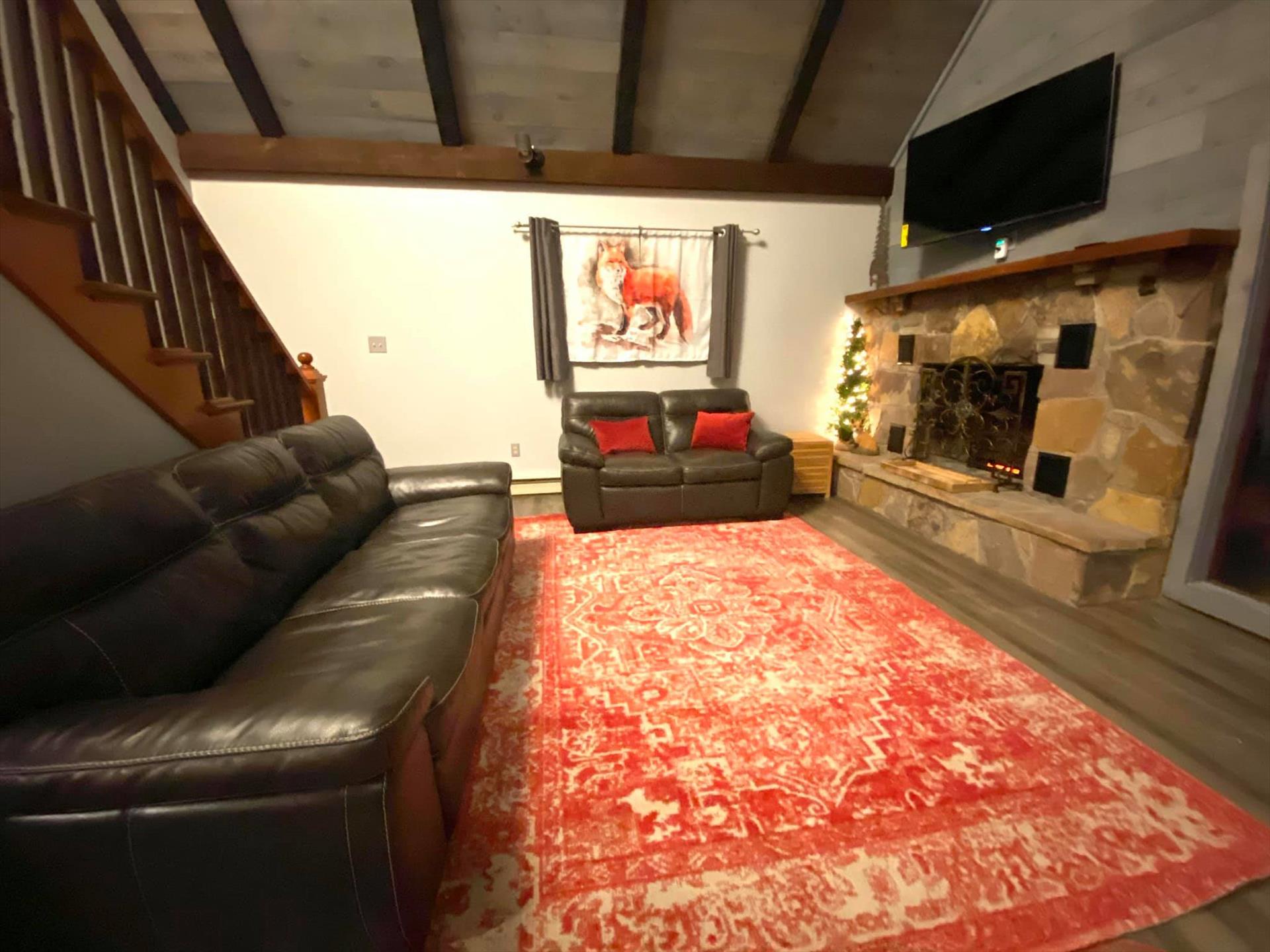 Livingroom - Roku TV, leather sofa and love seat, electric fireplace,
