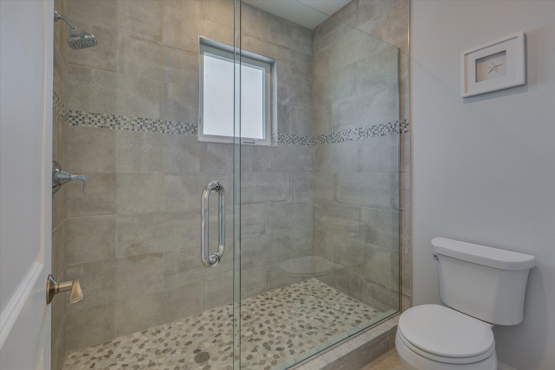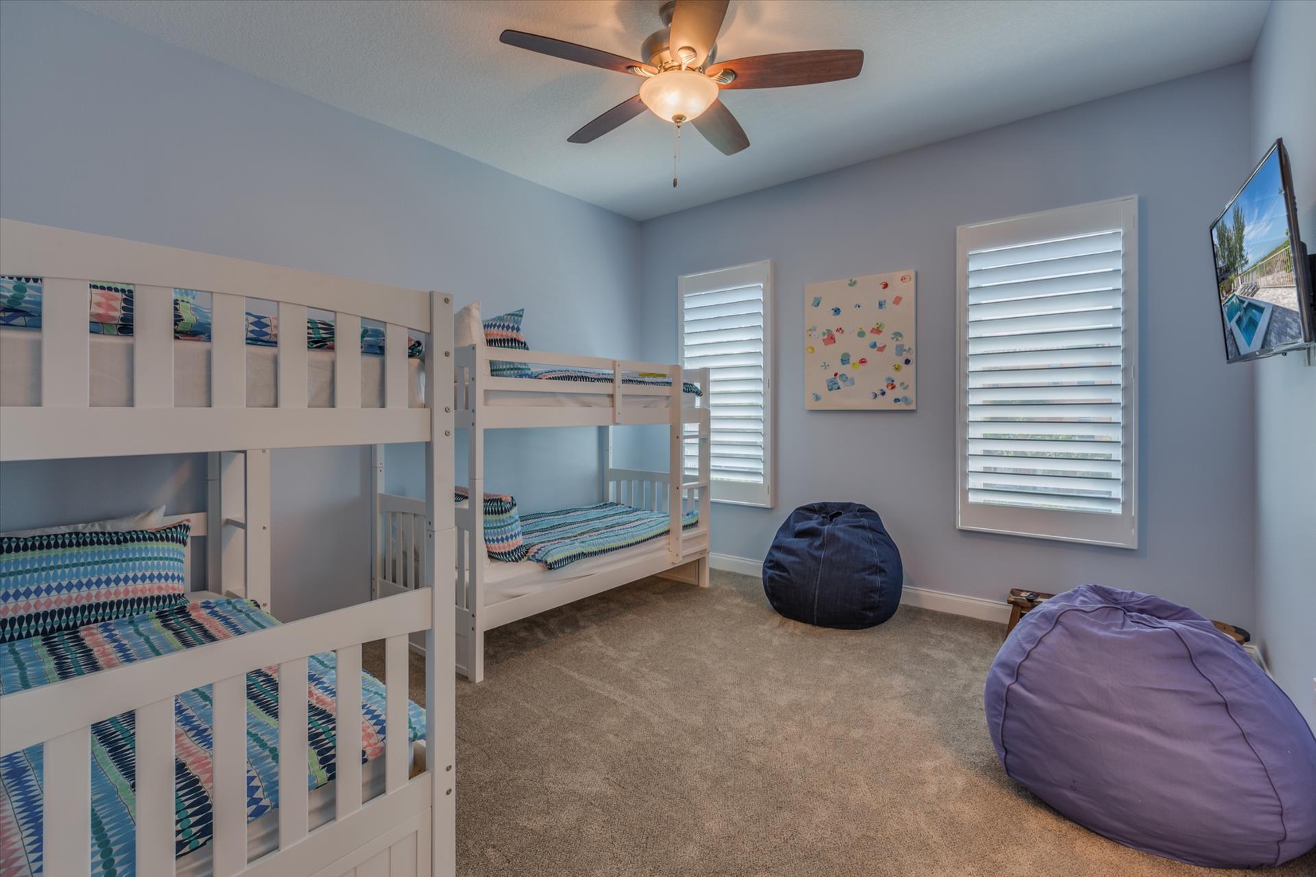On this level there are two bedrooms, one with a king bed, the other with two sets of bunk beds. These bedrooms share a Jack'n'Jill bathroom with shower. There is also a half bathroom for guests to use off of the living area.