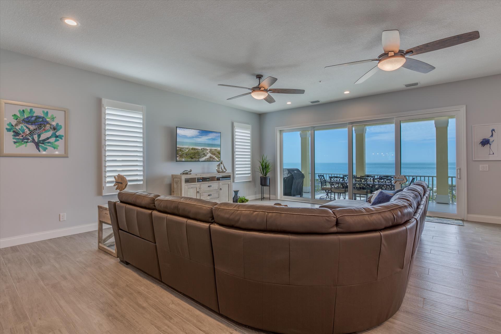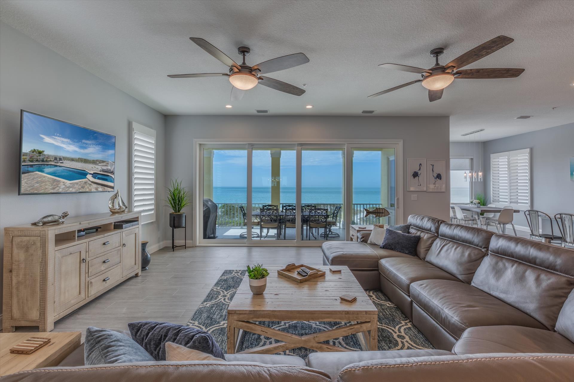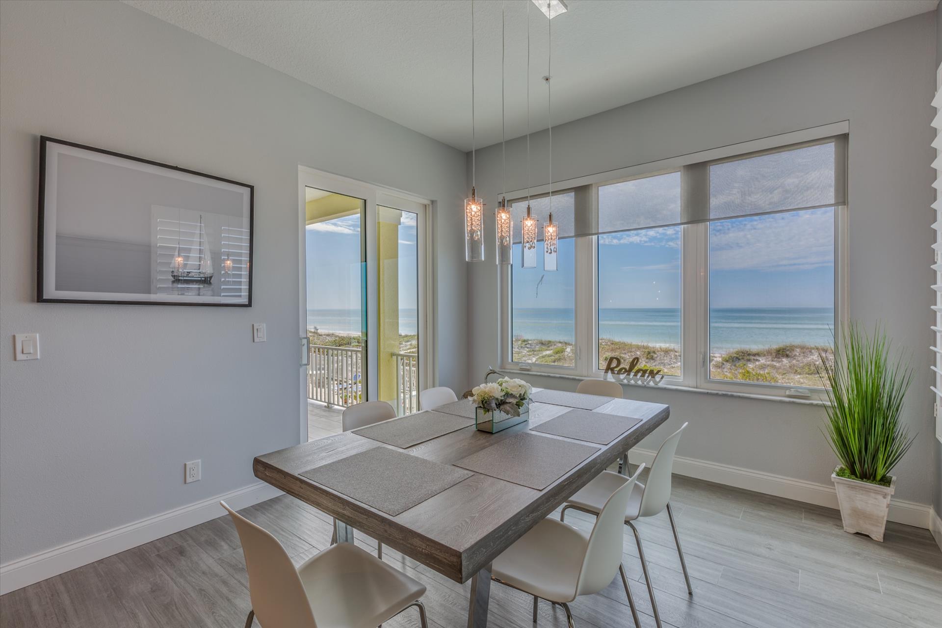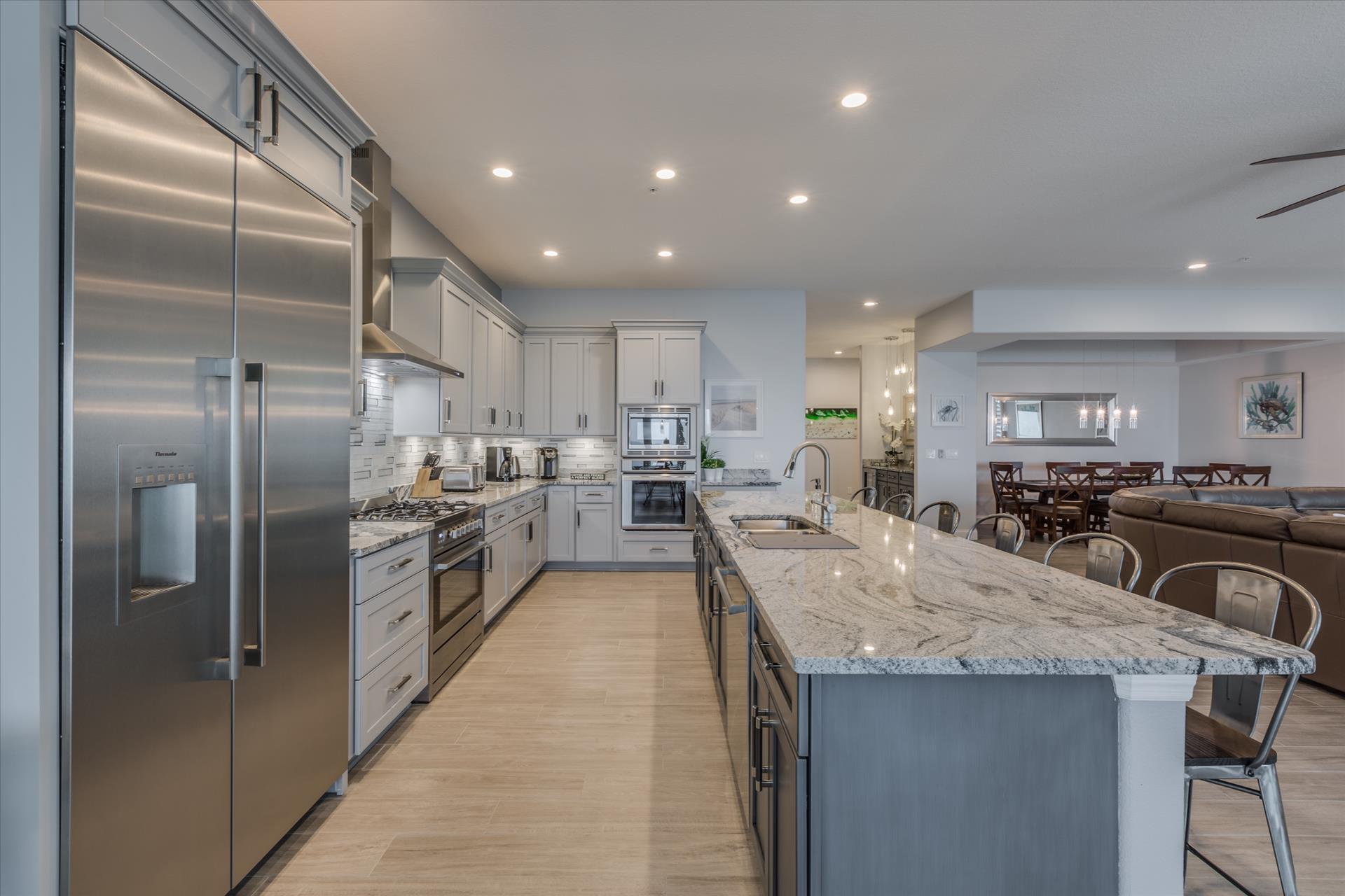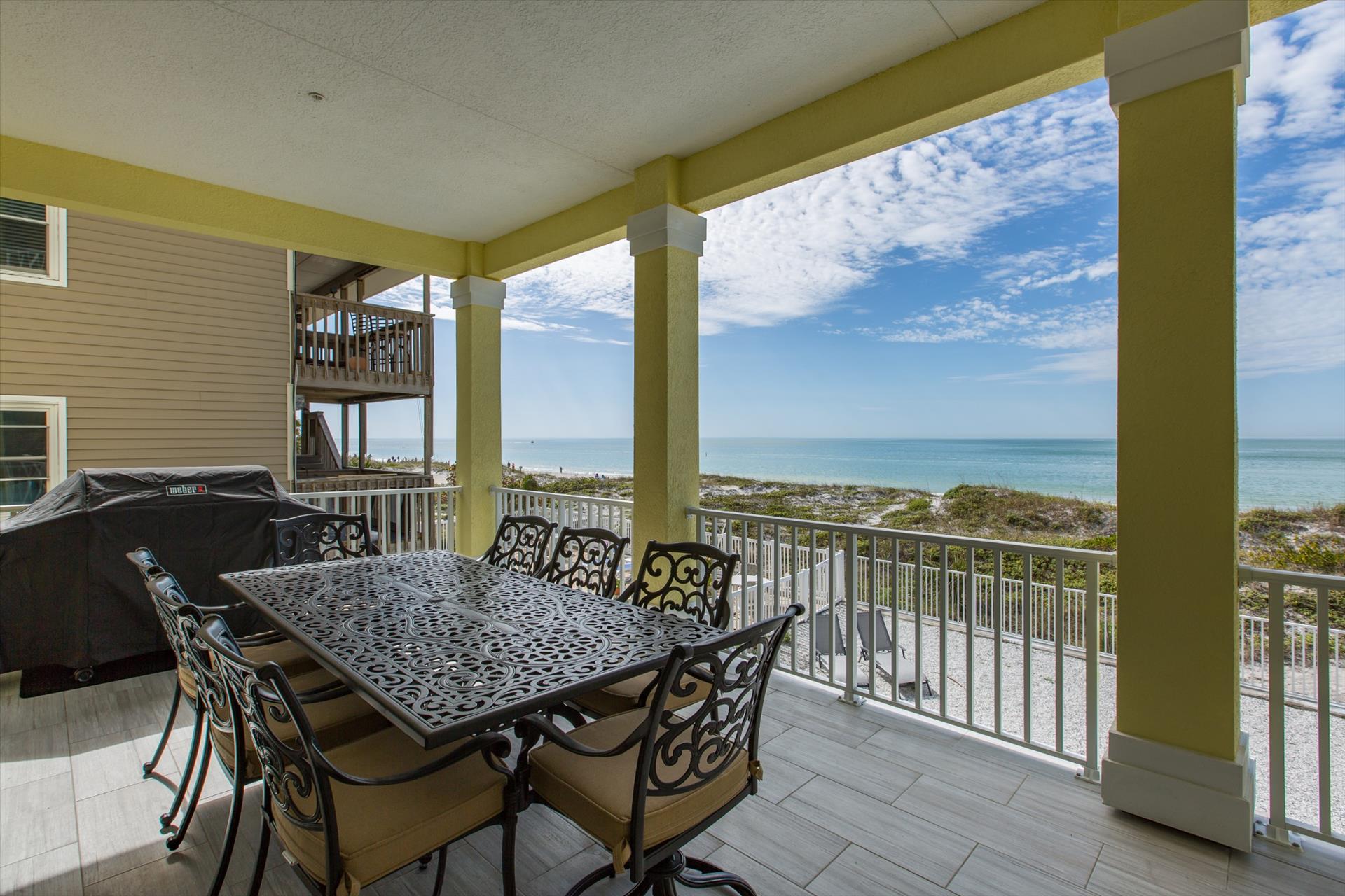 On the second floor you will walk into a large open living area with huge windows overlooking the beach. The living area also has a large sofa with flat screen TV. There is a fantastic kitchen featuring a gas hob and stove, electric combo oven/microwave, refrigerator and dishwasher with seating for 6 at the island. There is also a wet bar and breakfast nook together with a formal dining area. You can step out onto the balcony to BBQ or sit out and enjoy the breathtaking views.