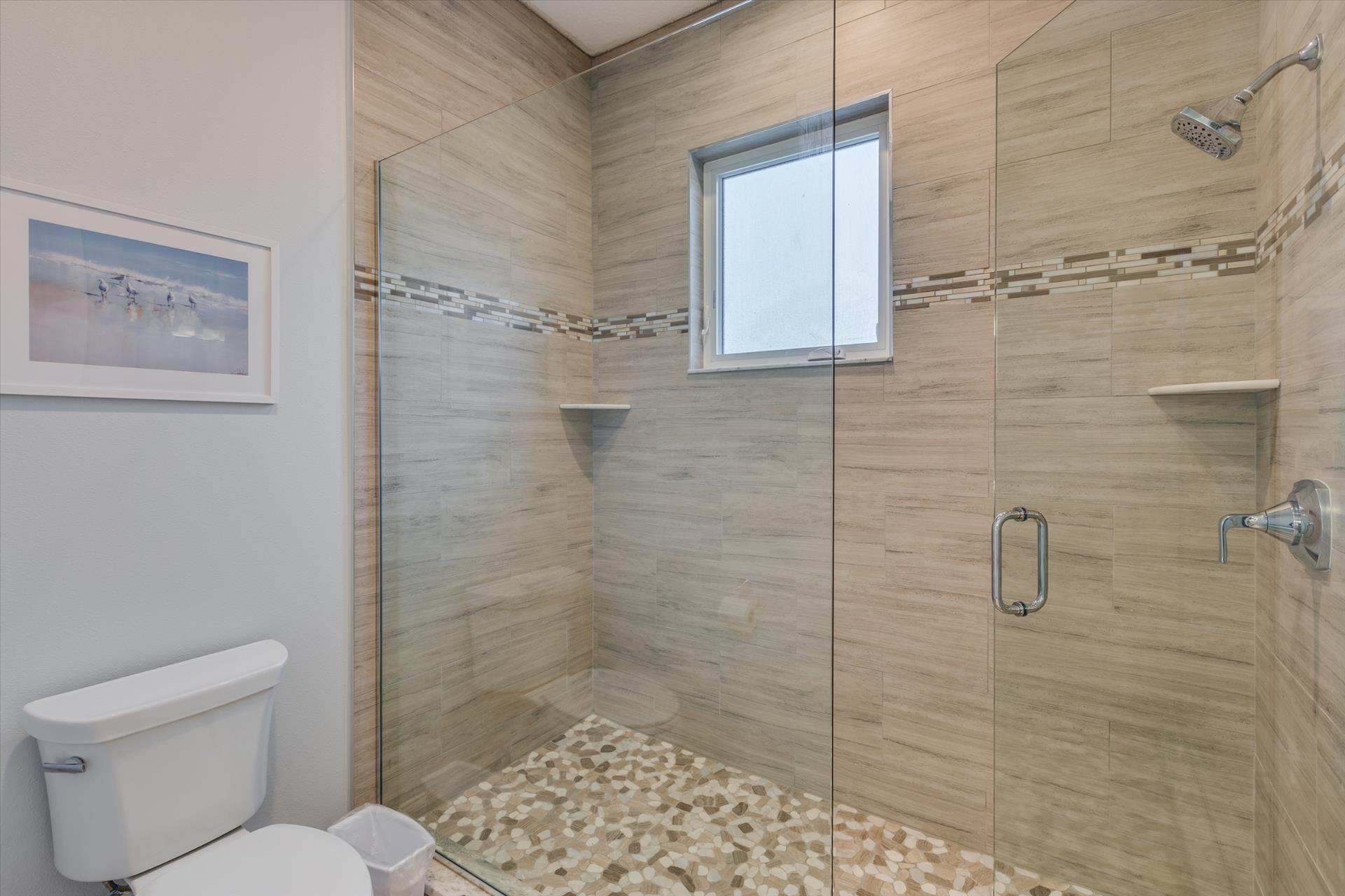 On this level there are two bedrooms, one with a king bed, the other with two sets of bunk beds, which will only accommodate children. These bedrooms share a Jack'n'Jill bathroom with shower. There is also a half bathroom for guests to use off of the living area.