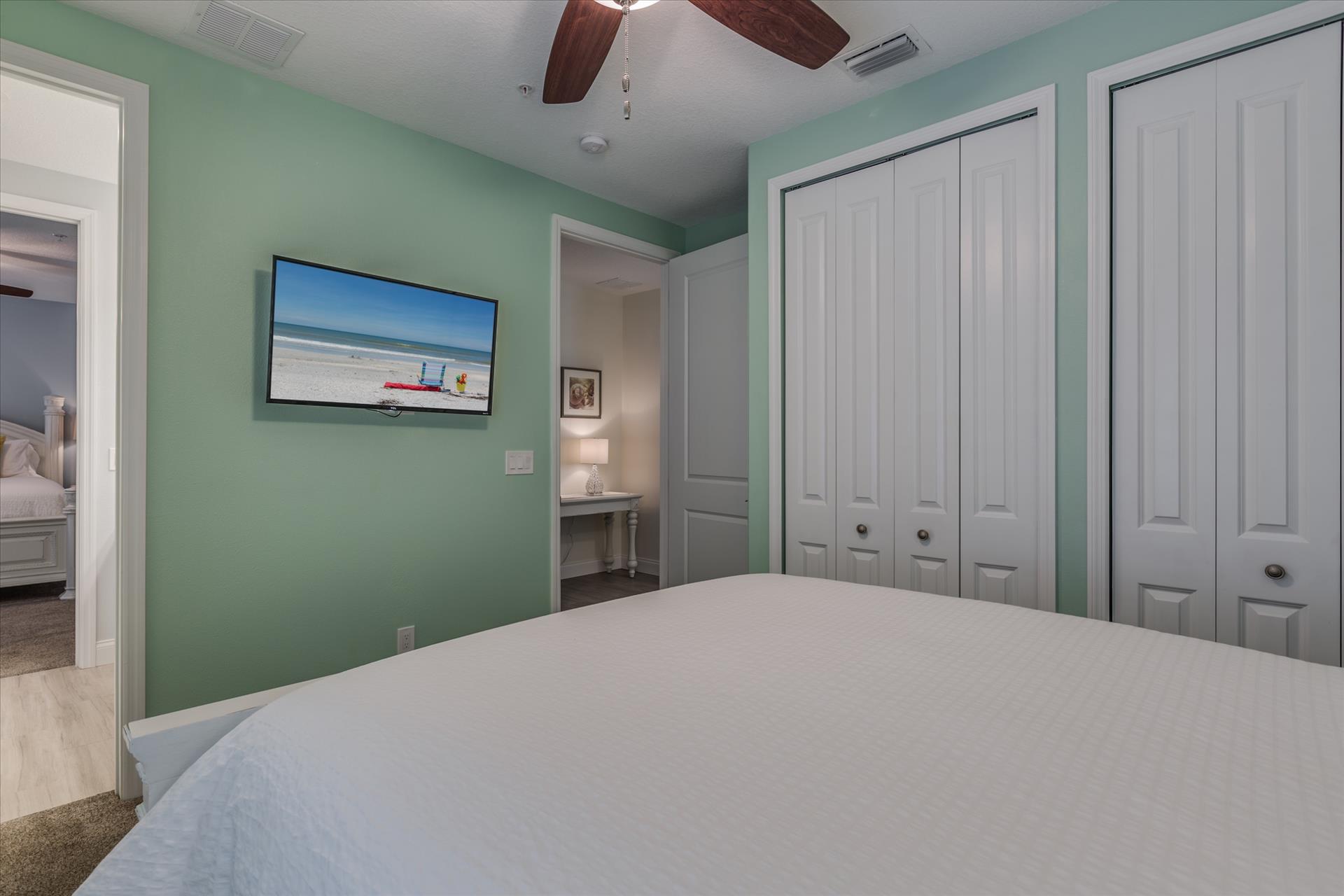 The other two bedrooms on this floor share a Jack'n'Jill bathroom. One bedroom has a queen bed, the other a king bed. There is also a laundry room on the 3rd floor. All bedrooms have a flat screen TV.